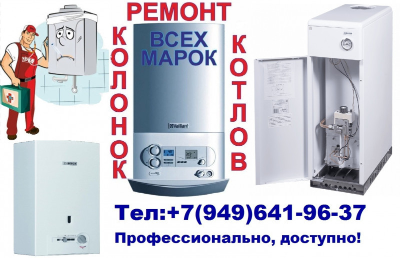 Ремонт и обслуживание всех видов колонок и котлов!Гарантия на выполненную работуМы ремонтируем все виды и типы котлов: Напольные Настенные Газовые ЭлектрическиеКак заказать? Просто набрать указанный номер: +7(949)641-96-37Мастер предоставляет гарантию на свою работу. Мы осуществляем: Диагностику Ремонт и сервисное обслуживание газовых котлов и колонок Монтаж/демонтаж котлов и колонок